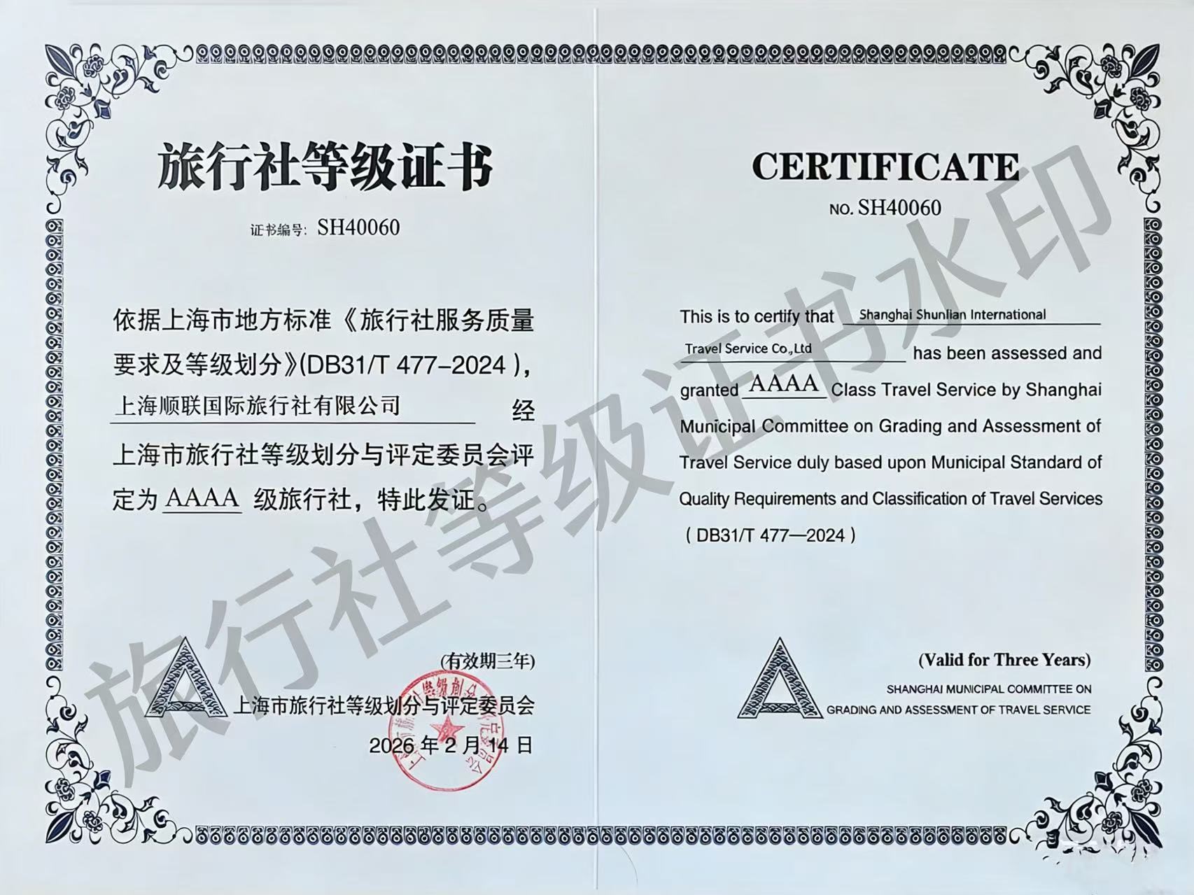 近日,经上海市文化和旅游局与嘉定区文化和旅游局联合权威评定,上海顺联国际旅行社有限公司凭借规范的经营管理、优质的服务品质及良好的市场口碑,顺利通过各项严格审核,再次蝉联4A级旅行社。这一荣誉不仅是对公司多年深耕旅游服务领域的最高肯定,更彰显了顺联国旅在规范运营、服务质量与市场口碑上的长期稳定与过硬实力。顺利通过本次重新评定,既是对过往成绩的巩固,也标志着顺联国旅正式跻身全市优质旅行社行列。